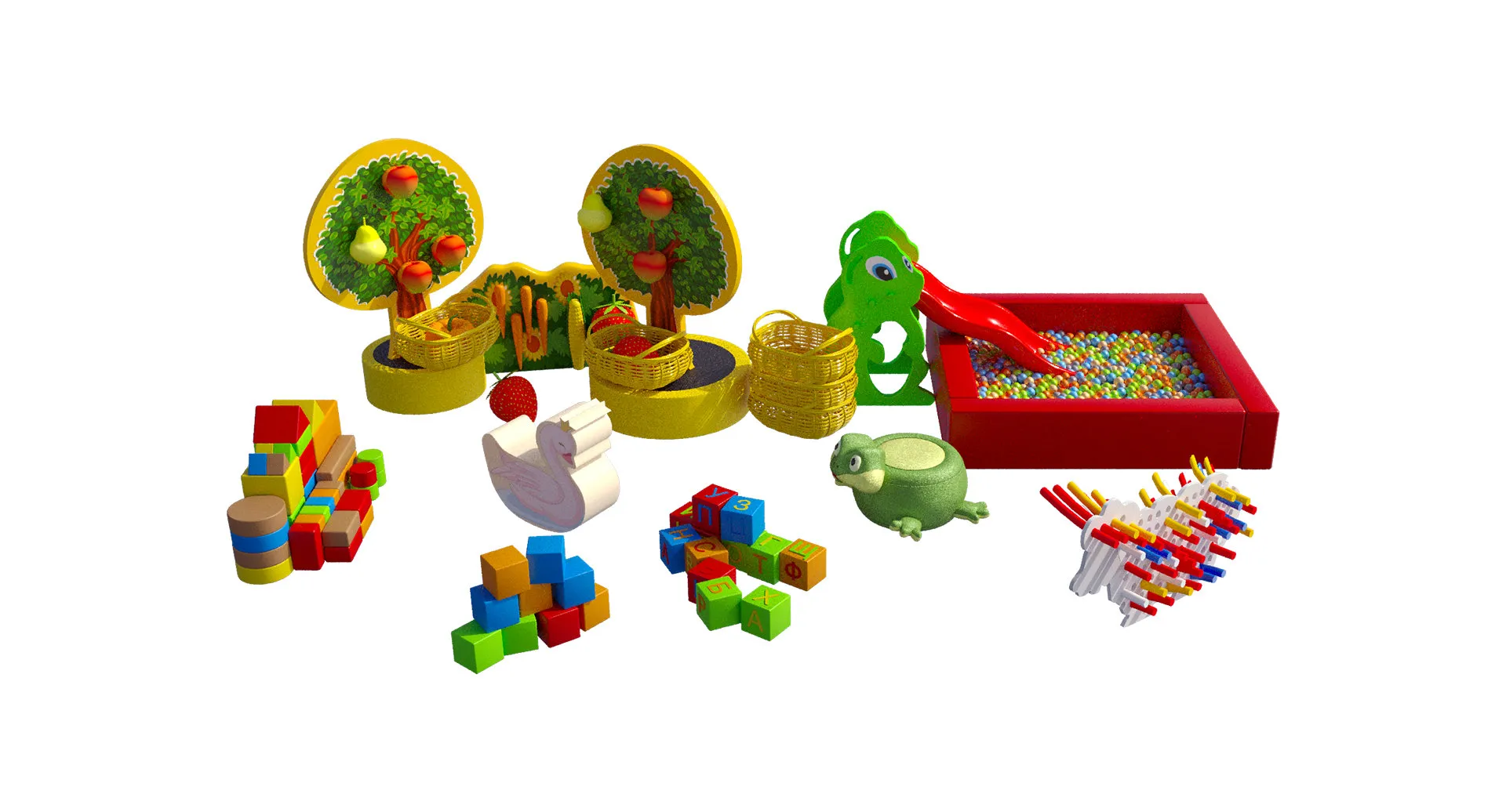 Центральным элементом является интерактивная зона с деревьями и грядками, где малыши могут «собирать» фрукты и овощи, развивая моторику и познавательный интерес. Сухой бассейн с горкой обеспечивает физическую активность, а разнообразные конструкторы и тактильные панели тренируют логику и сенсорику.