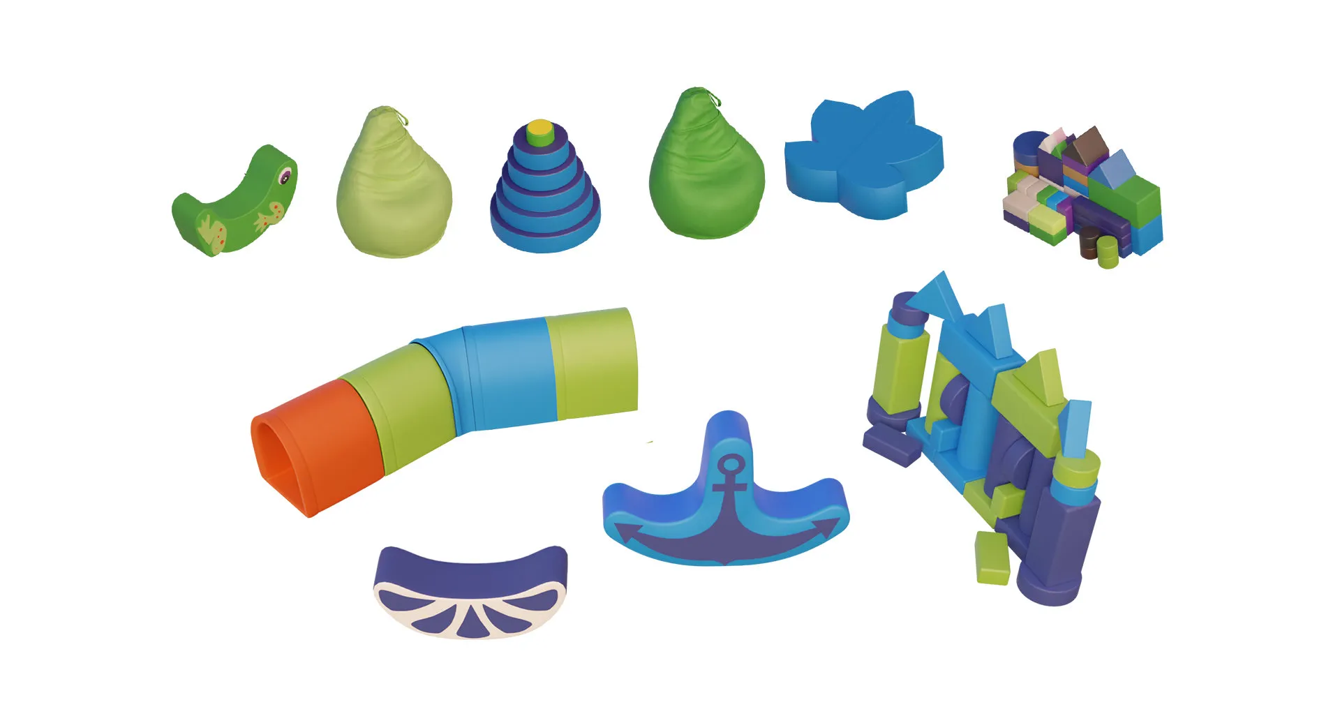 Комплект мягких модулей для детского центра «Риф» — это масштабный тематический набор в морском стиле, созданный для комплексного оснащения игровых комнат, детских садов и развлекательных центров. Разнообразие фигур позволяет организовать увлекательные сюжетно-ролевые игры, построить полосу препятствий и создать уютные зоны для отдыха.