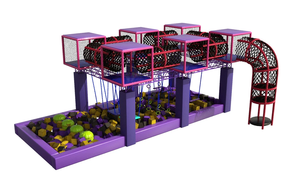 Комплекс оснащён мягкими матами и поролоновыми кубиками, которые покрывают все ключевые зоны для предотвращения травм. Элементы включают лестницы, подвесные кольца, канаты и другие активные препятствия, способствующие развитию спортивных навыков и командному взаимодействию.