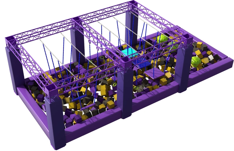 Ниндзя парк — это современный спортивный комплекс для развития ловкости, силы и координации в игровой форме. Конструкция выполнена на базе прочного каркаса с четырёхгранными фермами и усиленными колоннами. В комплексе представлены разнообразные этапы с подвесными элементами, балансирующими платформами и мягкими зонами для безопасного прохождения препятствий.