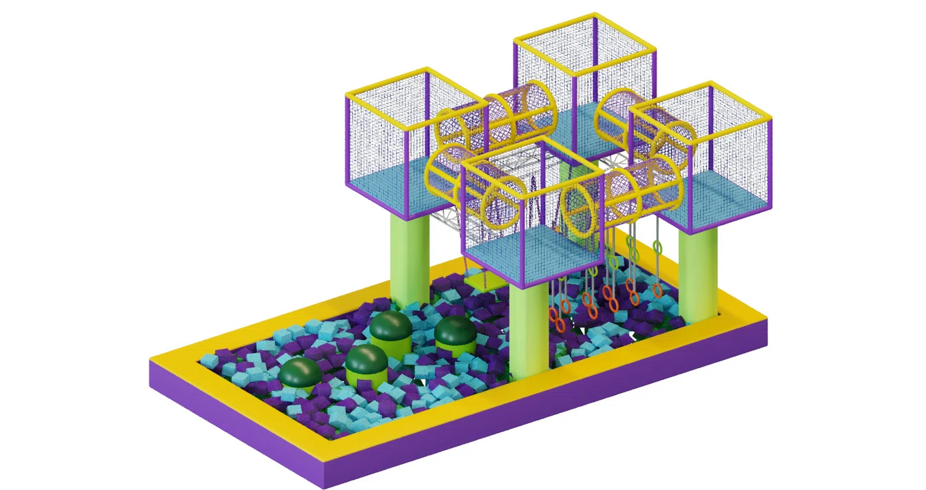 Комплекс рассчитан на одновременную игру нескольких участников, способствуя развитию командного духа и физической подготовки через игровой формат. Дизайн выполнен в яркой и насыщенной цветовой гамме — сочные фиолетовые, салатовые, жёлтые и бирюзовые оттенки создают атмосферу энергии, драйва и веселья.
