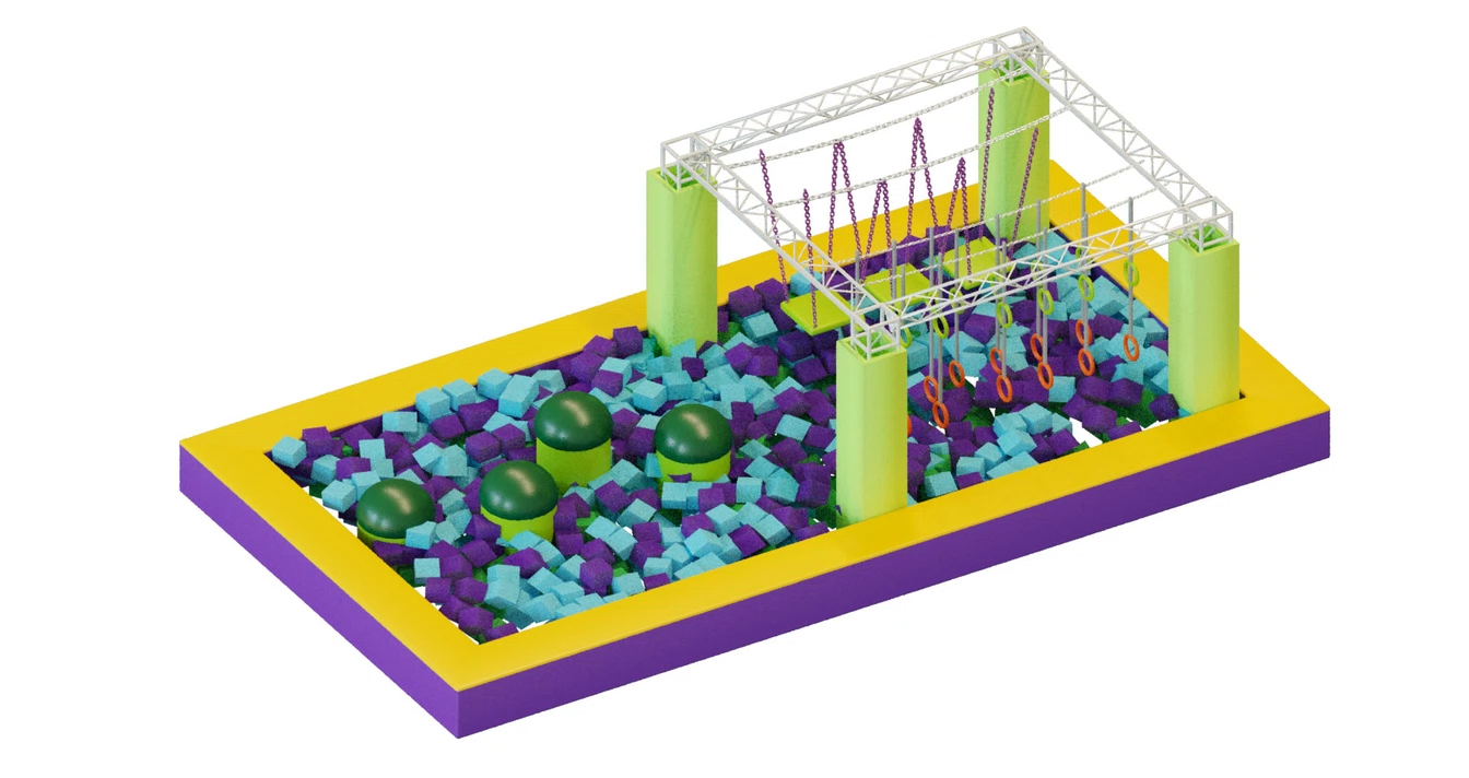 В парке размещены разнообразные этапы с уникальными препятствиями: канатные переходы, кольца, качели, балансировочные доски и подвесные платформы. Все активные элементы обрамлены мягкими матами и поролоновыми кубиками, что гарантирует безопасность при падениях и столкновениях.